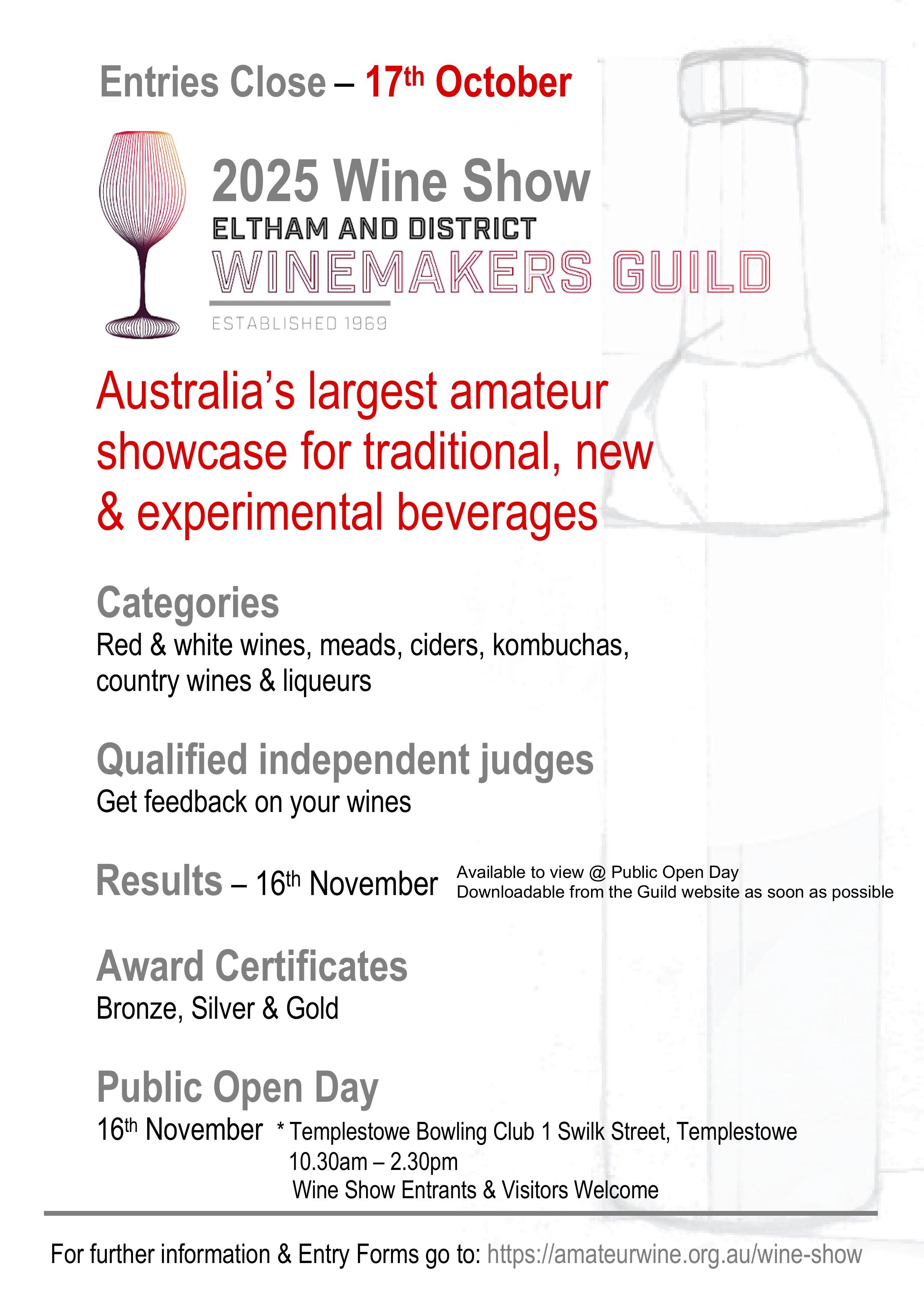 The Graham Scott WOTY is the Eltham Guild Winemaker of the Year. This is determined by totalling the three top scoring wines from any Eltham & District Amateur Winemakers Guild member - one wine of which must be a country wine, one a grape wine, and at least one of the three wines must be current vintage.